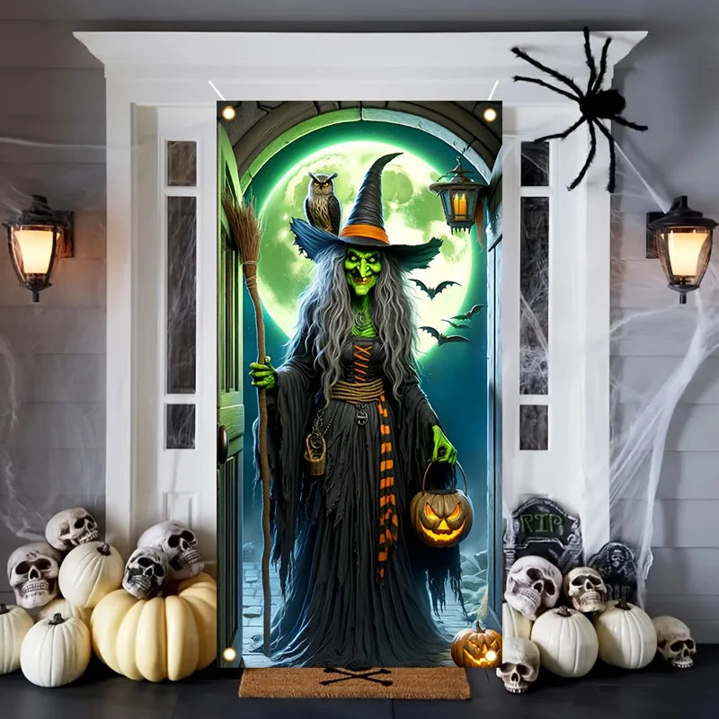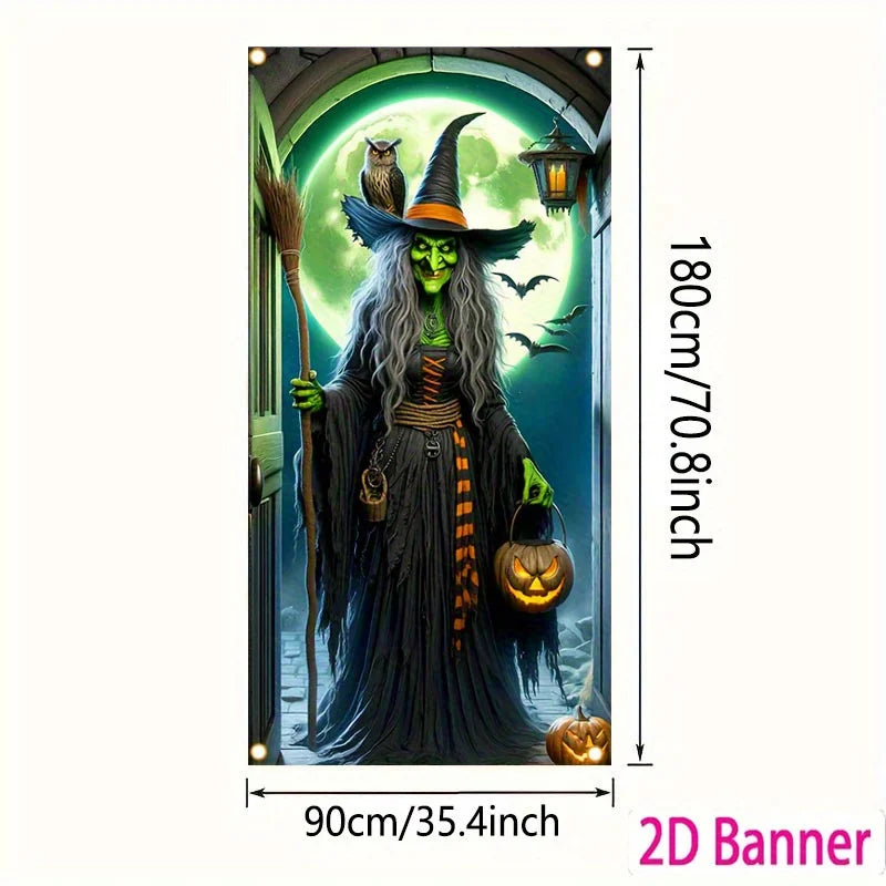 - 1 vnt. Helovino sodo vėliava su raganos ir pelėdos dizainu