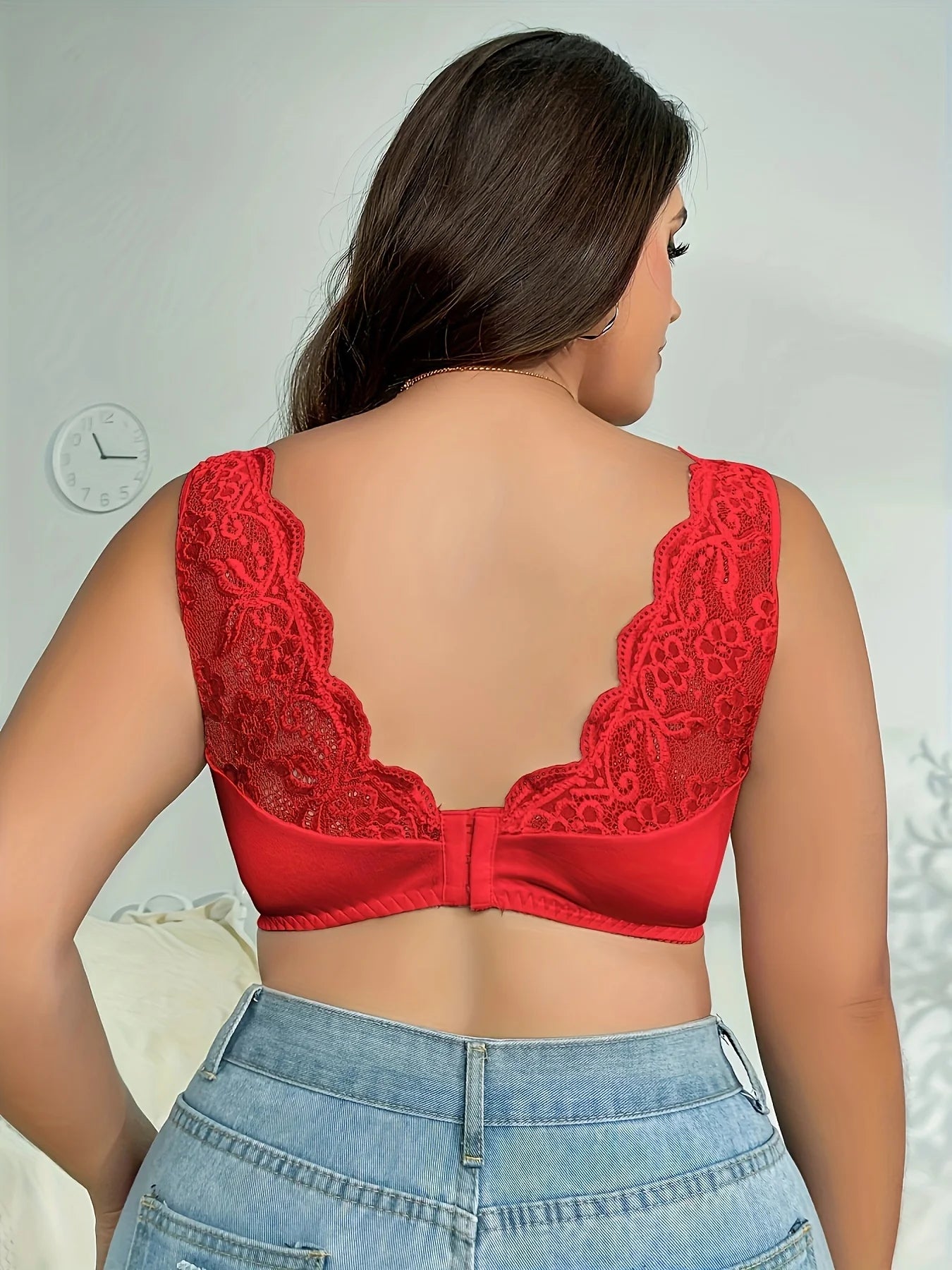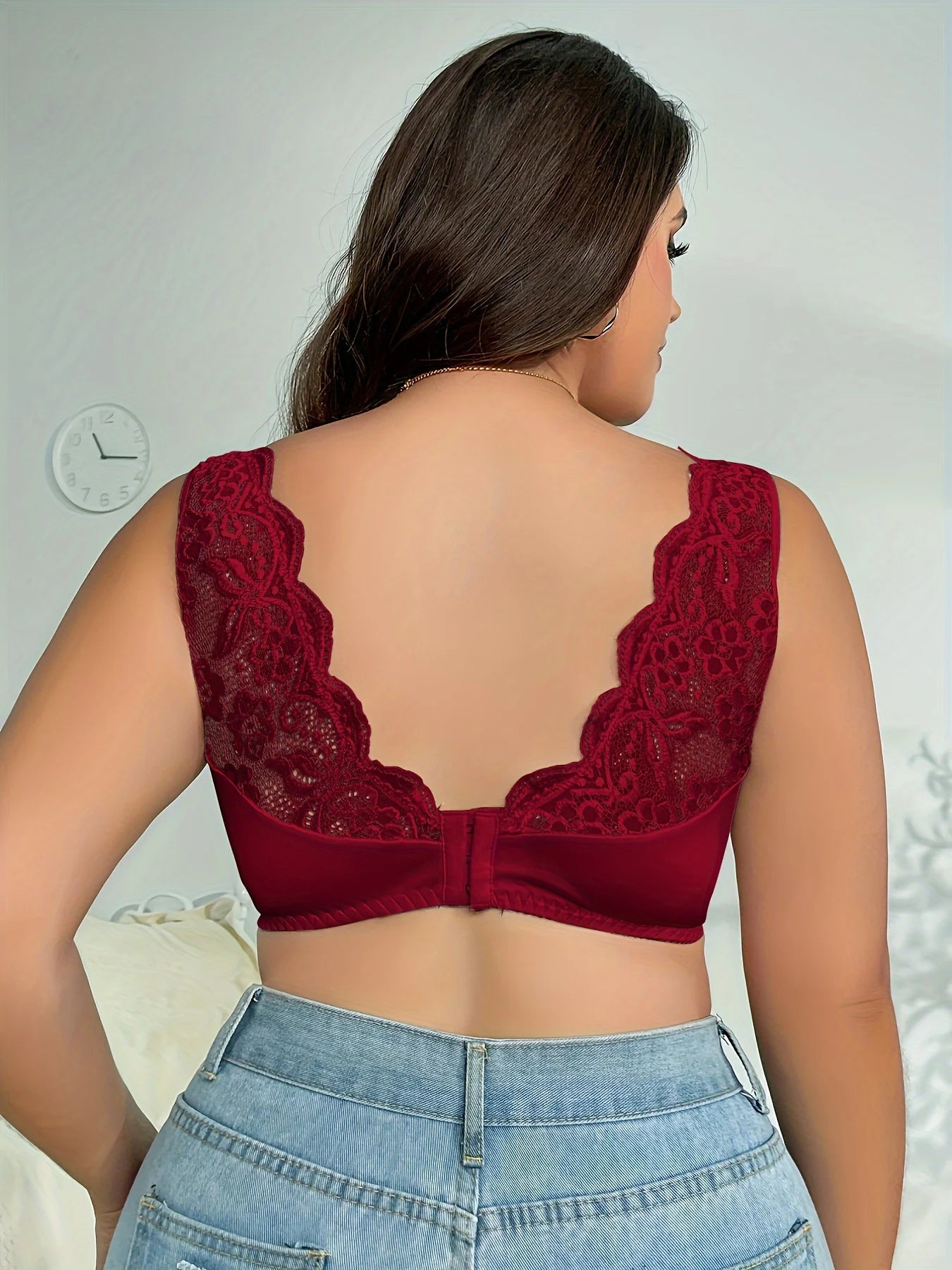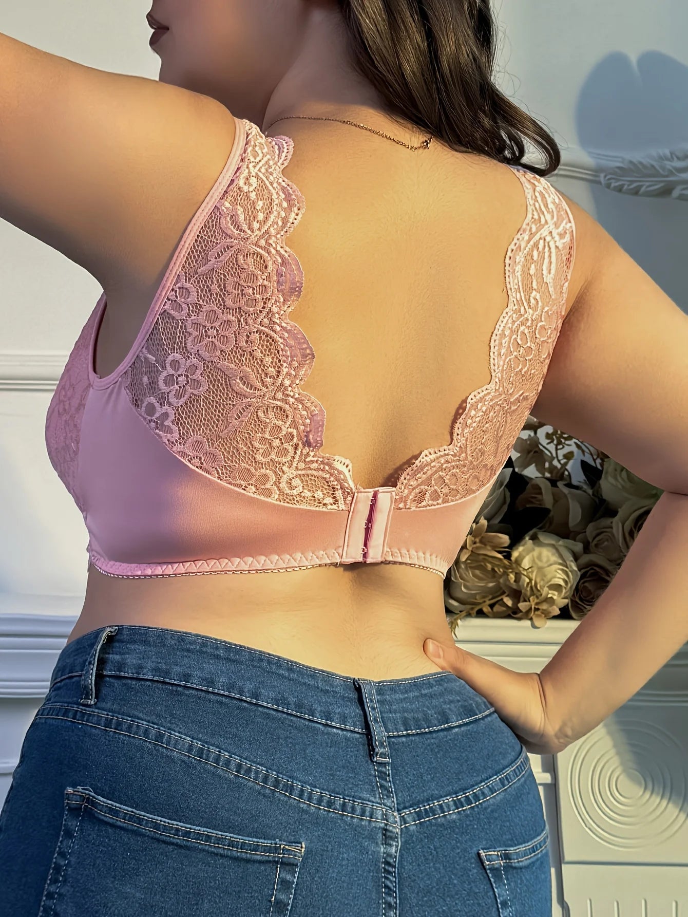 Didesnių Dydžių Elegantiškas Liemenėlis - Moterų Kontrastingas Gėlių Nėrinių Kraštas Aukšto Tempimo Plačių Petnešėlių Liemenėlis