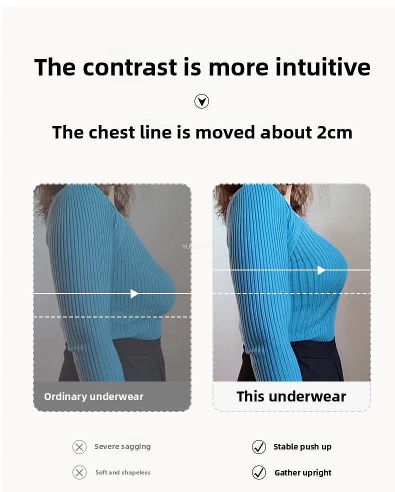 - Paskirstymo technologija: Krūtinė paskirstoma į šonus ir į viršų, sumažinant išsikišimą į priekį